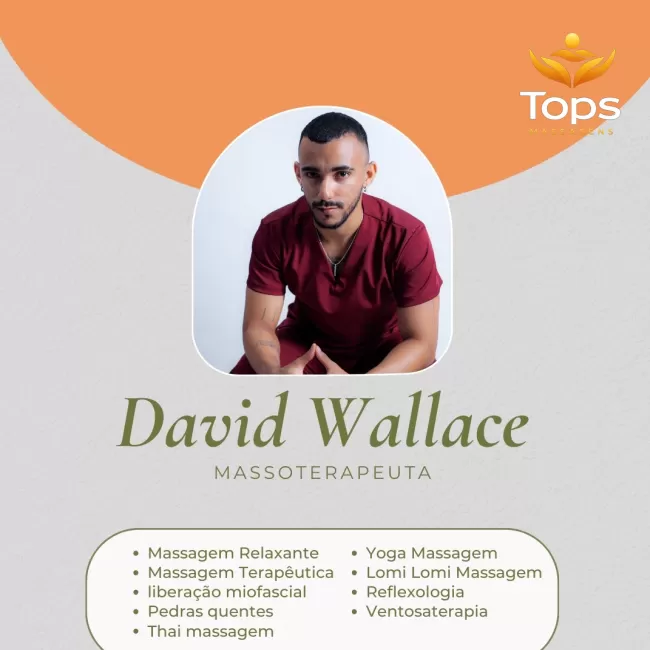 Sejam bem-vindos ao meu perfil. Me chamo David Wallace e atuo com a massoterapia e outras técnicas orientais. Meu propósito aqui é resgatar tua pausa, descanso e relaxamento que tanto precisa. Meu intuito é você não esquecer que desacelerar também é importante, porque você precisa de combustível, e é no descanso que isso vem. Se faz sentido para você, fala comigo pelo whatsaap!