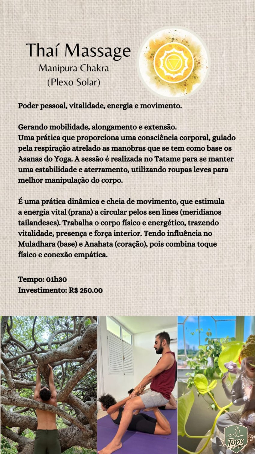 Com base nas técnicas do Pha Kao Ma (uso de um tecido Tailandês para manipular das articulações), a Thaí Massage, Lomi Lomi (massagem Havaiana, com um relaxamento profundo e ajudando na circulação sanguínea e na respiração consciente, fazendo também suas liberações Miofacial.